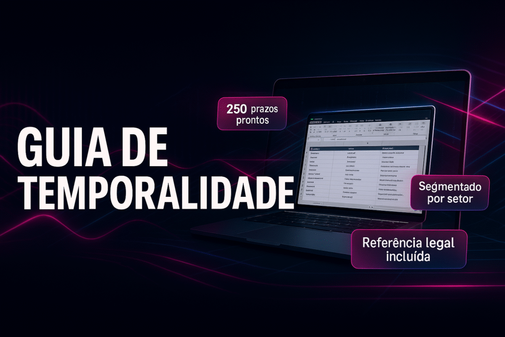 O Guia de Temporalidade reúne mais de 250 prazos de retenção organizados por setor (RH, Jurídico, Marketing, Educação e outros), com referências legais e estrutura pronta pra aplicar.